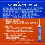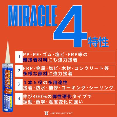 ミラクル4の1番の特長は、今まで接着が不可能であったポリプロピレンなどのオレフィン系やゴムなどの難接着材料にも強力に接着できる点です。その驚異的な接着性能を活かし、接着・防水・補修など幅広い用途でのご利用が可能です。